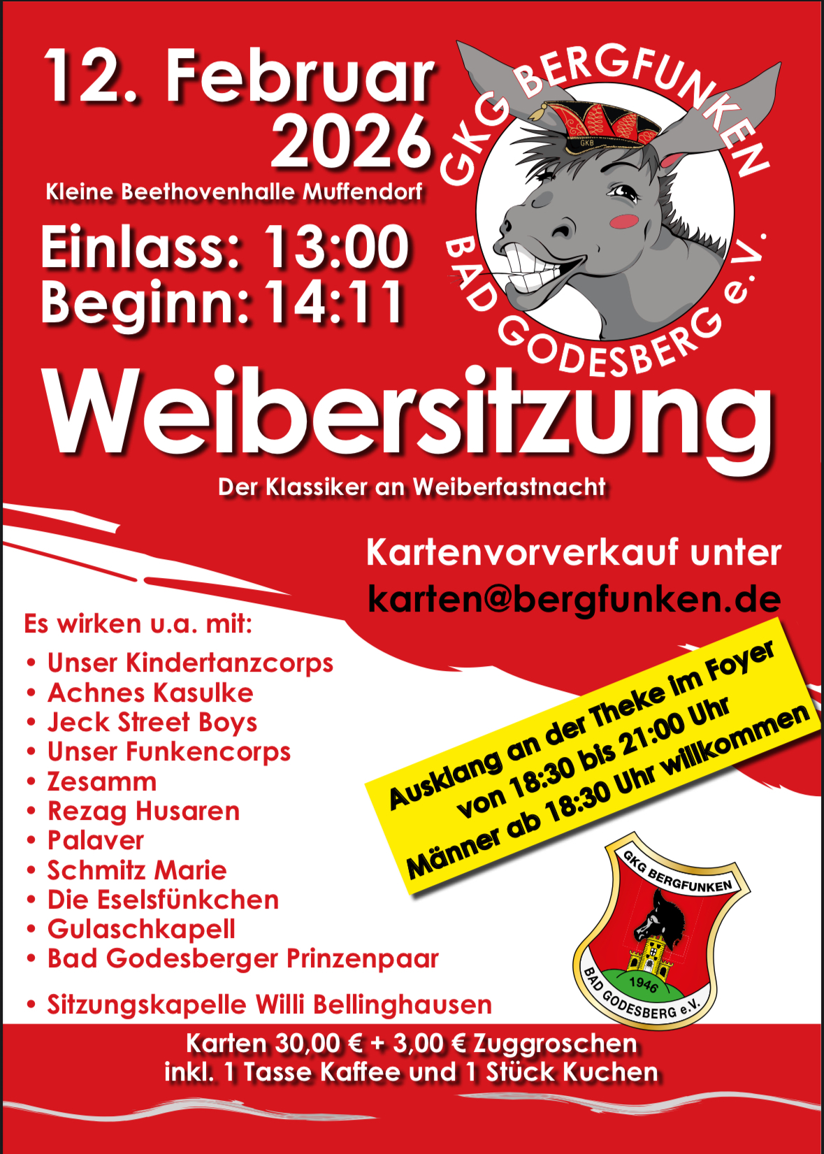 Flyer: Termine 2023-2024 Kartenvorverkauf unter: karten@bergfunken.de ACHTUNG: Der Kartenverkauf für das Kinderkostümfest findet ausschließlich an der Tageskasse (kein Kartenvorverkauf) statt: Kinder € […]